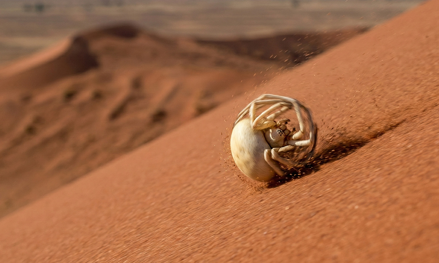 1. 昆蟲與節肢動物:水分收集與逃生大師 大霧甲蟲(Fog-basking Beetle): 擁有烏黑發亮、圓滾滾的硬殼,腿部修長。牠們是沙漠中最著名的集水大師。每當清晨濃霧捲入沙丘,牠們會爬上沙丘頂稜,迎著微風將屁股高高抬起,呈現完美的倒立姿態。牠們背部的外殼有著「親水性凸起」與「疏水性凹槽」的微觀結構,霧氣會凝結成完美的水滴,順著背部的溝槽直接滑進嘴裡。挖溝甲蟲(Trench-digging Beetle): 體型扁平像個飛碟,邊緣帶有細毛。牠們不倒立,而是厲害的土木工程師。在霧氣來臨時,牠們會在沙丘迎風面挖出一道道淺淺的溝槽。這些溝槽能攔截微小的霧水,當沙子吸滿水氣後,牠們再回頭把濕潤的沙子吸吮乾淨。跳舞白娘子蜘蛛(Dancing White Lady Spider): 全身呈現美麗的奶油白色,腿部強壯,喜歡在沙地上挖深洞居住。牠們最大的天敵是會把卵產在牠們體內的寄生蜂。為了逃命,或是為了避免在滾燙的沙面上走太久,牠們會將八隻腳縮起來,把自己捲成一顆球,像「風火輪」一樣順著沙丘斜坡往下狂滾,最高轉速可達每秒 44 圈!大霧甲蟲 挖溝甲蟲
