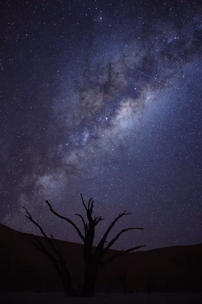 在納米比亞拍攝星空,真正的魅力並不僅在天空,而在於天空與大地之間的和諧對話。銀河固然壯觀,但能讓畫面真正有記憶點的,是前景的選擇與光線布局。死亡谷(Deadvlei)以其獨特的枯木剪影配合鹽沼與沙丘,在銀河背景下形成強烈對比;箭袋樹森林(Quiver Tree Forest)的樹形線條能自然引導視線向上,與銀河的弧線形成舞動的視覺節奏。