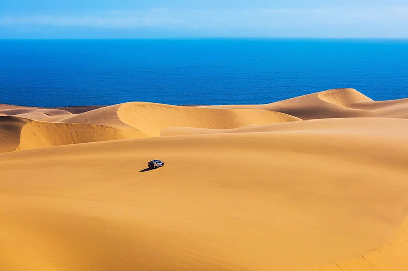今早接送服務將帶您前往鯨灣港,登上雙體船巡遊,探索鯨灣港潟湖和港口周圍的海洋生物。你可能會有機會看到低飛的大嘴鳥、海豹、海豚,在特定季節甚至能看到鯨魚、陽光魚和海龜!大約12點半左右,船長會把你送到鯨灣港海濱,專屬的嚮導會在那兒跟你會合,然後一起坐上四輪傳動車去三明治港 (Sandwich Harbour) ,天氣和潮汐情況允許的話,我們會直接前往目的地,這是南非最豐沃和獨特的濕地之一,也是納米比亞五個RAMSAR (國際重要濕地) 站點之一。它夾在海和納米比沙丘Namib Dunes之間,是納米比亞最重要的海岸濕地之一,這裡有大批涉水鳥類,其中有八種瀕危物種,還有幾個可追溯到一千年前的考古遺址。