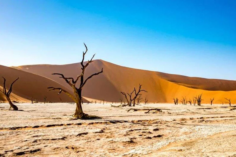 你的飛行將從奎斯布河 (Kuiseb) 河床起飛,穿越無盡的星形沙丘,深入到塞斯瑞姆Sesriem的納米比沙漠中心,這裡是通往索蘇斯芙雷和死亡谷 (Dead Vlei) 的入口。下午,你可以在休閒中度過,或者選擇自選的自然駕車之旅,探索你旅館周圍的沙漠。隔天早上需要早起。在日出時分,跟隨旅館的護林員進入納米布·諾克盧夫特國家公園 (Namib Naukluft National Park) ,初升的太陽將沙山塗繪成一系列的杏色、紅色和橙色,與清新的藍天形成鮮明對比,令你的感官歡騰,並提供了一個機會,用影片捕捉這令人敬畏的風景。您將會被超現實的死亡谷和索蘇斯芙雷所包圍,周圍是地球上最高的沙丘,乾燥的Tsauchab River在沙丘中突然終止。藉此機會登上這些雄偉的沙丘之一,欣賞下面的沙漠景觀。